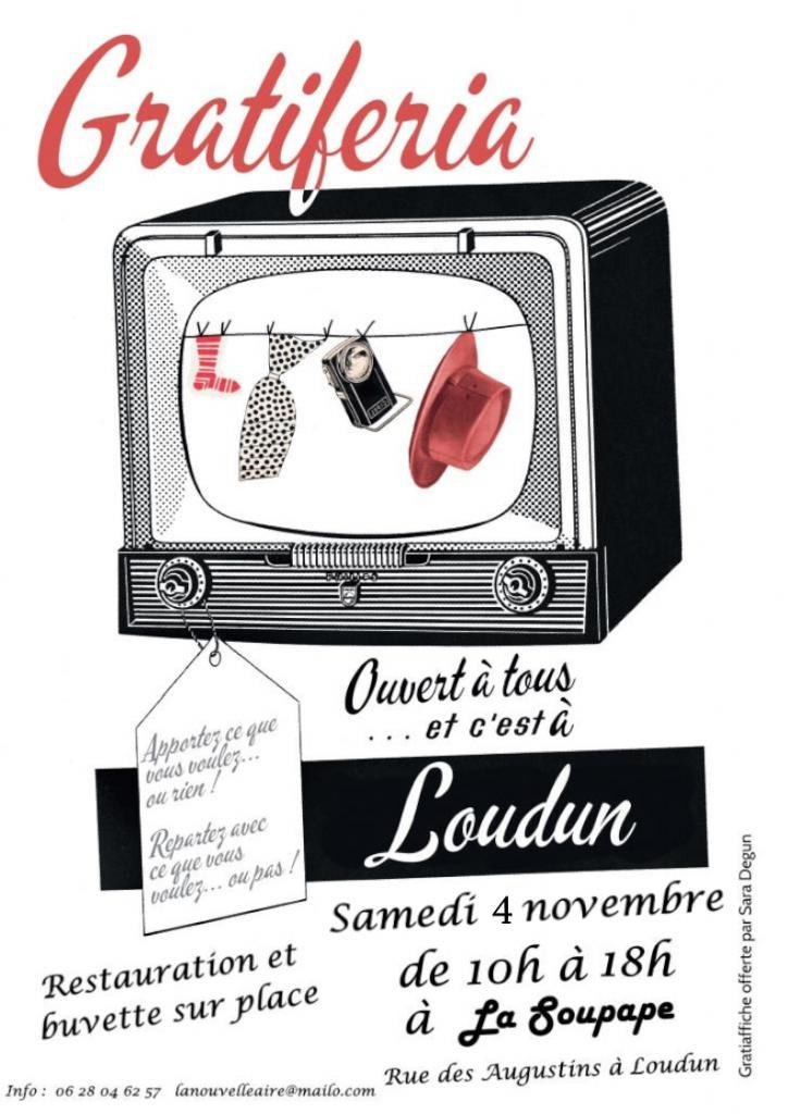 Du côté de Loudun un lieu culturel organise différentes animations il s’agit de la soupape la soupape se trouve 4 rue des Augustins à Loudun. À cette occasion l’association la nouvelle aire qui gère la soupape organise une gratiféria de 10h à 18h.