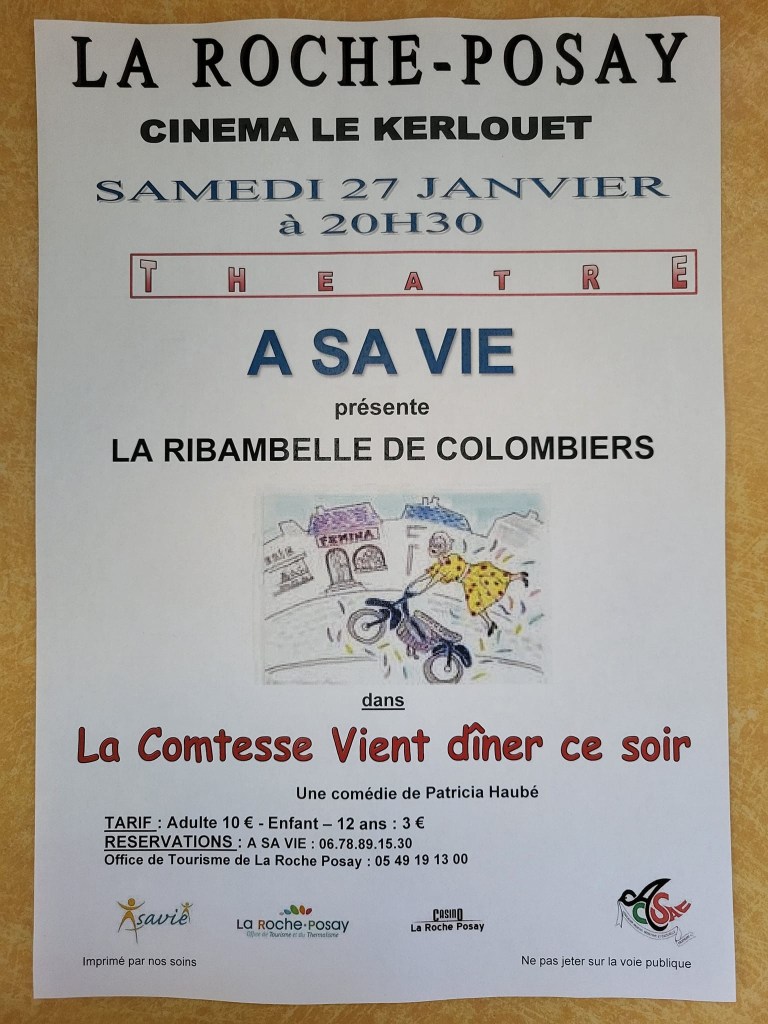 La comtesse vient dîner ce soir, comédie de Patricia Haubé, par la troupe de Colombiers La Ribambelle. Organisé par l’association A. Sa. Vie au profit des enfants brûlés, malades et des familles en difficulté.